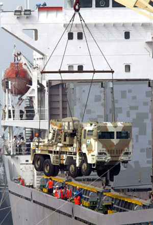 9日,派往伊拉克的宰桐部隊的卡車和軍用物資正在釜山港8號碼頭裝船。宰桐部隊將於下月初前往伊拉克的阿爾比勒地區。
