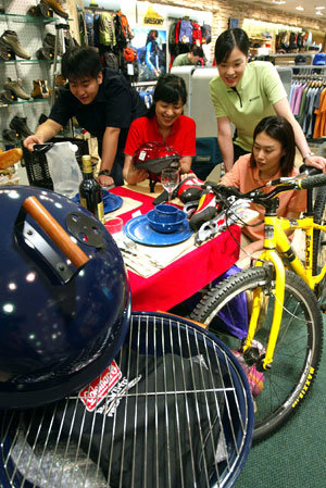 12日,漢城的一家百貨店擺出了與5天工作制相關的商品。從當天開始,公共企業和大公司等單位將實行5天工作制,因此,購買登山裝備、單排旱冰、自行車、野外食具等商品的人急劇增加。