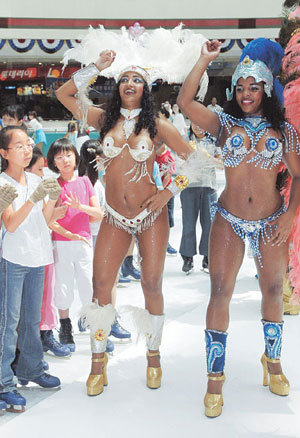 10日,在漢城松坡區蠶室樂天世界滑冰場舉行了“RIO SF桑巴狂歡節”。圖爲巴西的森巴舞舞蹈演員穿著華麗的服裝,與觀衆一起跳森巴舞。