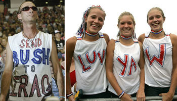 10日,布希總統和民主黨總統候選人克裏分別在佛羅里達州巴拿馬和內華達州拉斯維加斯舉行了遊說。圖爲穿著印有“把布希送往伊拉克”字樣短衫的克裏的支持者(左)和身穿印有“I LOVE YOU W(布希)”的縮寫“LUV YA W”短衫的布希的支持者。