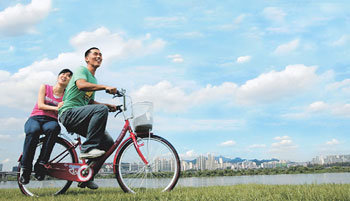 颱風“鮎魚”過後,天空一片晴朗。20日下午,在漢城永登浦區汝矣島漢江堤壩,晴朗的天空下,一對戀人親密地騎著自行車,宛如一幅山水畫。