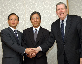 10日,外交通商部次官補李秀赫、日本外務省亞洲大洋洲局局長藪中三十二、美國國務院負責東亞及太平洋事務的助理國務卿詹姆斯·凱利(右起)在東京舉行3方會談,爲即將舉行的6方會談協調了各國的立場。