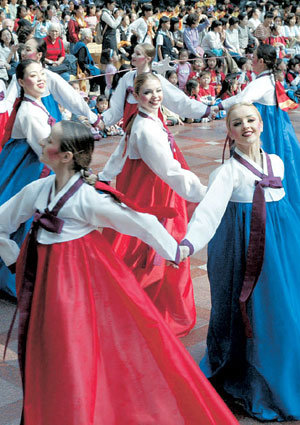 23일 서울 송파구 롯데월드에서 열린 한가위 민속 퍼레이드에서 롯데월드 공연팀이 한복을 곱게 차려 입고 강강술래를 공연하고 있다. 이 행사는 29일까지 계속된다.