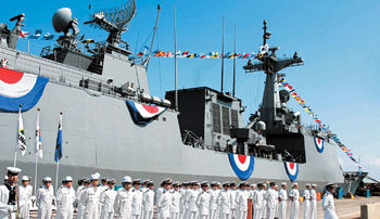 國軍日前一天30日,海軍接收了下一代韓國驅逐艦(KDX-Ⅱ)“文武大王艦”。現代重工業當天在蔚山舉行了有海軍負責人等各界人士參加的自行設計建造的4500噸級“文武大王艦”移交儀式。該驅逐艦長150米,寬17.4米,高7.3米,可搭乘300人,最大速度爲29節(時速 54公里)。尤其是具有對空、對潛艇、對地面作戰能力,而且在國內首次採用了能夠減少電子波和紅外線以及噪音的最尖端技術。