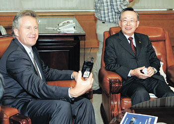 1日,在漢城中區明洞銀行會館,通用電氣(GE)總裁伊梅爾特(左)會見了副總理兼財政經濟部長官李憲宰,他手裏拿著廣播用無線麥克風正與李憲宰親切交談。當天,兩人討論了針對韓國的GE的投資擴大方案。