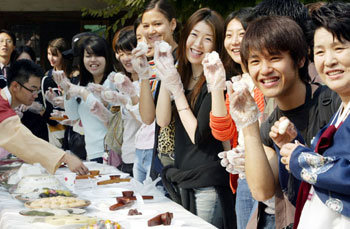 截止到9日,韓國傳統飲食研究所和漢城鍾路區廳將在雲峴宮舉行“宮中及士大夫傳統飲食慶典”。7日,參加“體驗製作宮中糕點”活動的外國學生們正舉著自己親自製作的糕點。