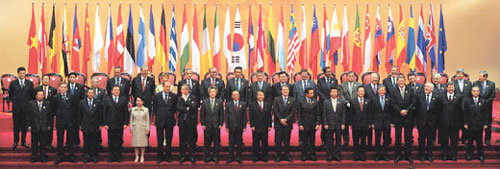 8日,在越南國會議事堂舉行的第5屆亞歐首腦議會(ASEM)開幕式上,各國首腦正在拍紀念照。盧武鉉總統(前排右數第7位)當天強調對聯合國進行改革,演說進行了10分鐘,遠遠超過了原定的3分鐘。