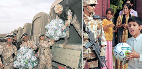 的巴赫勒卡(音譯)村。宰桐部隊計劃,把東亞日報社在今年3月用讀者們的贊助金購買捐贈的5萬個足球送給伊拉克兒童。圖爲從卡車上搬運足球的場面(左)。得到刻有象徵太極標誌和親善的“韓國-伊拉克”英文字樣的足球後,伊拉克兒童歡天喜地。