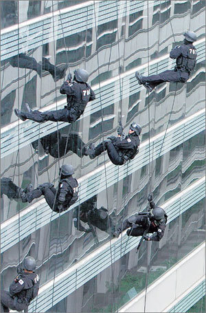 11日下午,在漢城江南區三成洞韓國貿易中心,特警隊員們正在進行通過屋頂進入建築物內部的反恐演習。此次演習是自國際恐怖組織基地組織向韓國發出恐怖襲擊威脅後,針對大型建築物及多功能設施恐怖襲擊進行的。