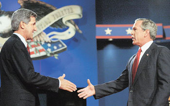 13일 미국 애리조나주 템피의 애리조나주립대에서 진행된 3차 TV 토론회 시작 직전 악수를 나누고 있는 조지 W 부시 미국 대통령(오른쪽)과 존 케리 민주당 후보. 두 후보는 이날 일자리, 의료, 교육, 줄기세포 등 국내 쟁점을 놓고 공방을 벌였다.