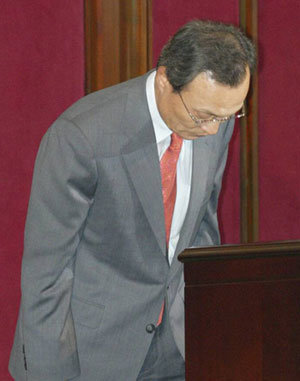 上月25日,在國會總會場,國務總理李海瓚代讀盧武鉉總統的施政演講稿後正在敬禮。李海瓚能否爲國會的正常化對國民道歉,令人關注。