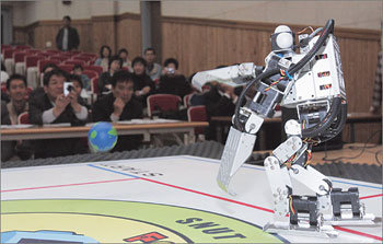 7日,在漢城盧原區孔陵洞漢城産業大學舉行的“雙足步行機器人”行進比賽中,一名參賽選手展示的機器人像人一樣站著,用手扔球。