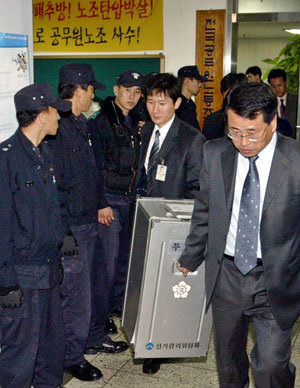 9日,因全國公務員工會(簡稱全公會)漢城九老區支部強行進行罷工贊成與反對投票而緊急出動的警察對支部辦公室進行搜查後,沒收了投票箱等物品,正在走出大門。當天因政府的根本性封鎖,全公會的大部分投票均告流産。