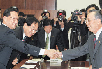 政府和開放的我們党於11日舉行了有關房地産擁有稅制會議,決定從明年開始將國稅廳對標準市價超過9億韓元的住宅擁有者徵收的綜合房地産稅稅率分爲3個等級。圖爲經濟副總理李憲宰(右)和開放的我們党政策委議長洪在馨正在握手。
