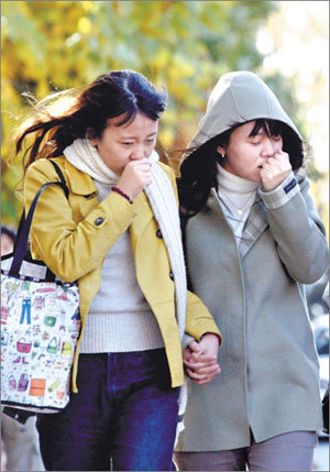 12日,全國氣溫普遍下降,出現了初冬天氣。圖爲在漢城弘益大學,女學生正頂著寒風加快腳步。據氣象廳預測,周末13日,中部地區和漢城等地區氣溫將降至零下。