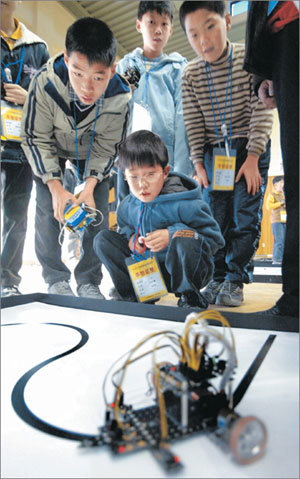13日,在漢城鍾路區孝悌小學講壇舉行的第1屆全國學生機器人前進比賽上,參賽學生們正在操縱自己製造的“行走機器人”。當天的比賽由社團法人韓國學校機器人教育振興會舉辦,共有全國130多個小組參加比賽,展開了激烈的競爭。