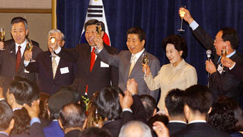 13日下午(當時時間),盧武鉉總統(左四)和夫人權良淑在美國洛杉磯聖路易酒店舉行的旅美同胞座談會上,正在與出席者乾杯。