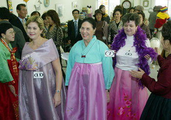 18日,在漢城松坡區回收使用文化館舉行的“回收使用産品服裝表演及生命禮物義賣活動”上,展示了法國大使、以色列大使、羅馬尼亞大使的夫人們(左起)親手修改過時的韓服製作的宴會禮服。