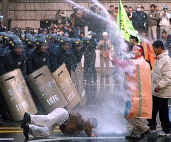 19日,在漢城市廳前漢城廣場舉行的“死守大米,敦促改革農協的350萬農民大會”上,農民們舉行集會後,試圖向青瓦台方向遊行,但遭到警方的水槍射擊,一名農民倒在地上。