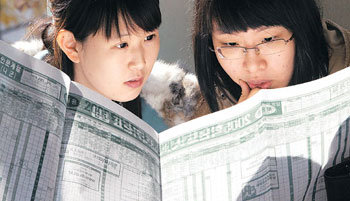 23日,在漢城銅雀區鷺梁津洞某補習班,考生們正在認真觀看各大學定期招生高考分數分佈表。由於從今年開始高考分數計算方式有所改變,直到下月14日公佈成績表爲止,沒有明確的資訊。因此,考生和家長想方設法尋找有用資訊。