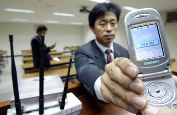 25日,電波遮罩裝置生産企業SOREK(株)的職員們正在測試將設置在漢城大學第一工學館前的電波遮罩裝置。漢城大學爲了防範30日進行2005學年度隨時招生面試時,學生們利用手機泄露考題的情況,做出了在各專科大學設置電波遮罩裝置的決定。