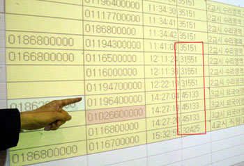 29日下午,漢城地方警察廳網上犯罪調查隊有關人士正在指出在高考當天發送的數位手機短信中,懷疑是答案的數位(紅框內)。紅框左側是手機號碼(刪除位數)和傳送時間,右側是相關時間舉行的高考科目。