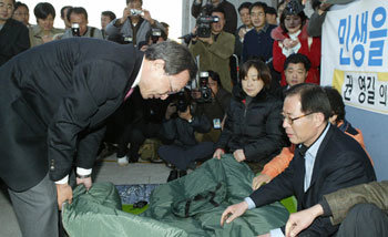 國務總理李海瓚(左)在國會本廳前,正在向絕食示威的民主勞動党議員權永吉90度鞠躬。李海瓚向權永吉道歉說:“就(在警方闖入過程中)沒有遵守禮貌一事,我道歉。現在請站起來吧。”權永吉接受道歉,結束了爲期一周的絕食示威。