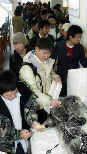 在不景氣時,區內餐廳生意火爆?8日午餐時間,在漢城崇實大學區內餐廳,學生們排隊等待。