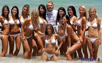 9日,維珍航空公司總裁布蘭森在澳大利亞悉尼邦迪海邊與“環球小姐邦迪選拔賽”參賽者們共度了愉快的一天。布蘭森爲宣傳維珍航空公司的香港~悉尼航班,正停留在澳大利亞。