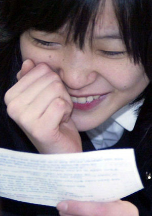 14日,記錄標準分數的2005學年度高考成績表發放到考生手中。14日上午,漢城德城女子高中3年級的一名學生看著成績表,笑容滿面。