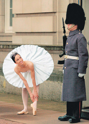 14日,英國國立芭蕾舞團芭蕾舞劇《胡桃夾子(Nutcracker)》中扮演糖果妖精的芭蕾舞演員西蒙·科拉克(音譯)在守衛白金漢宮衛兵面前做出一副滑稽的表情。當天,《胡桃夾子( Nutcracker)》劇組成員爲出席芭蕾舞團贊助者安德魯王子(伊麗莎白女王的次子)主辦的宴會,來到了白金漢宮。
