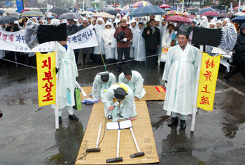 15日下午,“成均館家族法對策委員會”的成員們在漢城站前廣場舉行反對“戶主制”泛國民大會,他們冒著大雨向盧武鉉總統“持斧上疏”(是朝鮮時代上疏中最強硬的上疏方式,意思是‘如果上級不接受我們的建議,就請用斧頭將我們的頭顱砍下來’)。