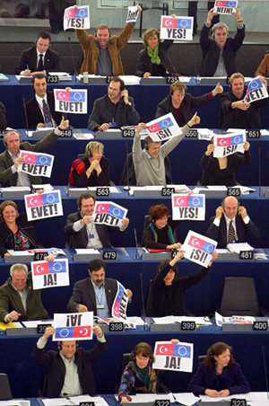 15日,歐盟(EU)領導人在歐洲議會上通過了“儘快開始土耳其加入EU談判”的決議案。該決議案的投票結果爲,407人贊成、262人反對、29人棄權。雖然該決議案沒有任何約束力,但有可能對從16日開始舉行的EU領導人會談産生影響。圖爲議員們舉起用各國語言寫著“是”的牌子。