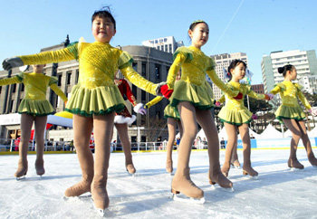 23日,在漢城市廳前漢城廣場開業的滑冰場上,萊拉小學的學生們正在舉行開業慶典演出。