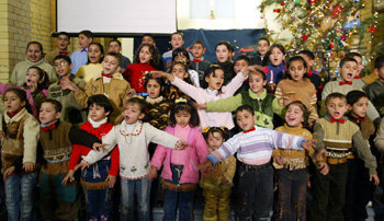 圖爲23日,巴格達兒童在巴格達聖喬治教堂正在唱聖歌。該教堂因擔心發生恐怖事件,提前一天舉行了耶誕節活動,並取消了耶誕節午夜彌撒。目前,伊拉克共有75萬名基督教徒。