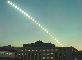 2004年,憲法法院做出駁回總統彈劾決定、判決《新行政首都建設特別法》違憲,左右了韓國社會潮流。圖爲27日,在位於漢城鍾路區齊洞的憲法法院建築物上方,太陽逐漸西沈(每隔10分鐘拍攝)。