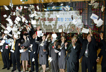 30日,在漢城永登浦區汝矣島洞大信證券總公司營業部接待室舉行的今年股市停盤儀式上,職員們正在把股票交易用紙和資料抛向空中。當天的綜合股價指數以比去年年底上升85.21點(10.5%)的895.82點收盤。股市將於2005年1月3日重新開盤。