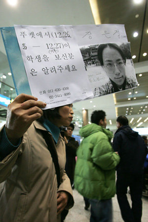 30日上午10時左右,從泰國普吉島起飛的大韓航空客機載著126名乘客抵達了仁川機場。乘客中包括在普吉島受傷的10多名遊客。圖爲前往普吉島旅遊後失去聯繫的中央大學學生張恩貞(音譯)的姑姑手舉牌子,向入境的乘客詢問外甥女的消息。