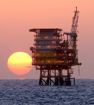 在東海油田平臺後方,紅色的太陽正在升起。因東海油田,韓國成爲世界排名第95位的產油國。祝願今年的韓國經濟也能像東海日出一樣,一洗去年的頹廢欣欣向榮。
