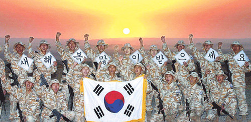 在韓國宰桐部隊的駐紮地伊拉克埃爾比勒,新年第一天的太陽正在冉冉升起。以破曉的太陽爲背景,宰桐部隊士兵們正在向祖國敬禮。