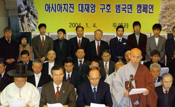 4日上午,在漢城新國際酒店舉行的“亞洲地震大災難救災泛國民運動”成立記者招待會上,月珠大師呼籲全國國民伸出援助之手。前排左起爲,民族宗教協定會會長韓陽元、韓國基督教總聯合會會長崔成圭、地球村分享運動理事長姜汶奎、月珠大師、分享和喜悅代表孫鳳鎬。