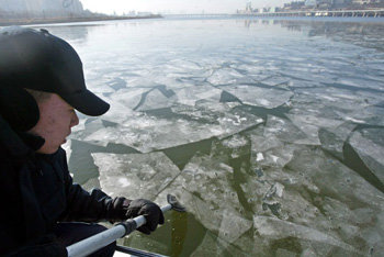 進入冬天以來天氣最冷的5日,漢城廣津橋附近的漢江結了冰。圖爲,漢城江東警察署漢江巡查隊廣津波哨所警察乘坐快艇,觀察漢江結冰情況。當天,漢城早晨最低氣溫降至零下8.8度。