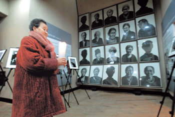 6日,居住在京畿光州市退村面元堂裏“分享之家”的日軍慰安婦出身的朴善玉奶奶點著蠟燭,走到挂在分享之家歷史館內的慰安婦老人們的肖像畫前。