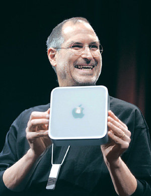 圖爲11日(當地時間),在美國舊金山舉行的“蘋果全球峰會”上,美國蘋果電腦公司總裁喬布斯舉起新款“Mac mini電腦”(售價爲499美元)。喬布斯的脖子上還挂著售價格爲99美元的廉價的新款“蘋果Shuffle”(MP3播放器的一種)。