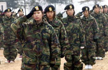 18日下午,參加京畿富川市陸軍特種部隊司令部歸鄉(音譯)部隊冬季特別訓練營的女學生們正在舉行入營儀式。陸軍特種部隊司令部從18日到21日,以4天3夜的日程在下屬5個部隊開設了學生訓練營。