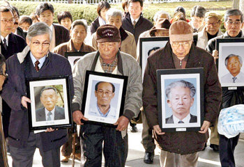 日本廣島高等法院於19日判決,日本政府和三菱重工業應對被強制徵用並在原子彈爆炸中受害的40名韓國勞動者支付賠償金。日本高等法院對居住在外國的原子彈爆炸受害者做出賠償判決尚屬首次。圖爲申根洙(音譯,前排中)等原子彈爆炸受害者在進入法院前,手裏捧著遇難者的畫像。