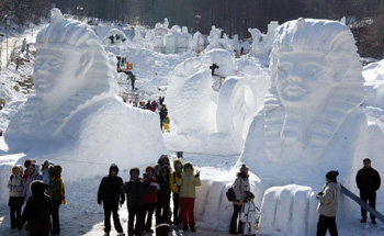 21日下午,來到江原太白市太白山道立公園雪雕展示場的遊客們在用雪雕刻而成的獅身人面像前正在拍照。第12屆太白山雪慶典將舉行到30日,本屆慶典的主題是“夢想和現實結合”。慶典期間將舉行坐狗拉雪橇、雪雕展示等豐富多彩的活動。