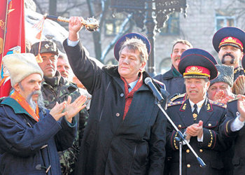 領導被稱爲“橙色革命”的烏克蘭市民革命的優先科總統于23日在首都基輔舉行了就職儀式,從此烏克蘭進入了新的時代。圖爲優先科在就職儀式前一天被支持者圍在中間,舉起了象徵大權的黃金棒,但陷入經濟危機的烏克蘭的未來並不一定會“金光閃閃”。