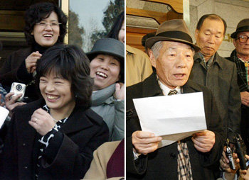 觀看憲法法院對戶主制違憲判決的相關團體表現出不同的反應。3日下午,在首爾鍾路區齊洞憲法法院前,反對廢除戶主制的市民聯帶的會員們(左)對憲法法院的判決歡呼。相反,成均館儒林們(右)正在發表譴責判決的聲明書。