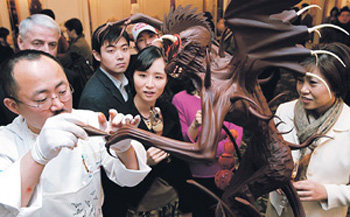 13日,洲際大酒店爲迎接情人節(14日),舉行了“巧克力促銷活動”。在“2005年糕點杯大賽”上獲得巧克力工藝二等獎的崔仁浩(左)在本次活動中展出了巧克力雕刻作品。